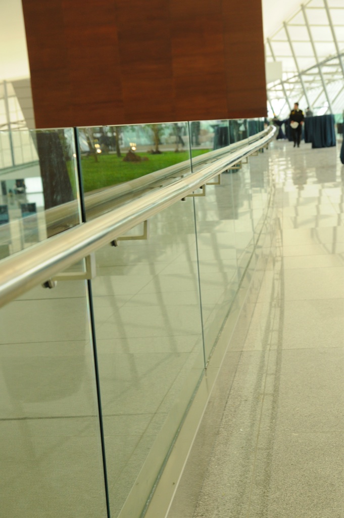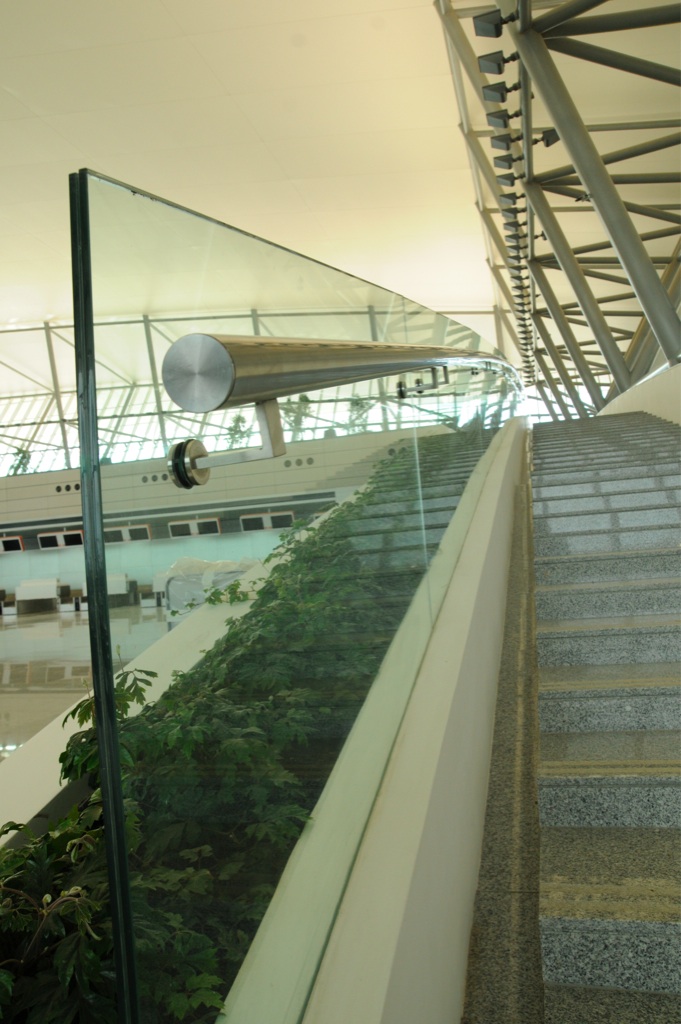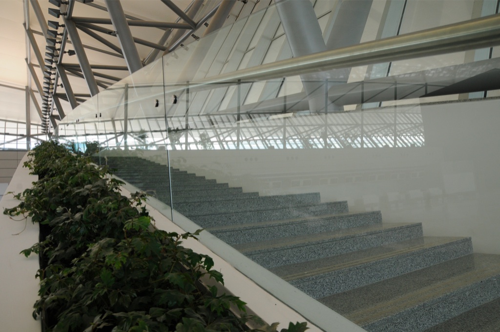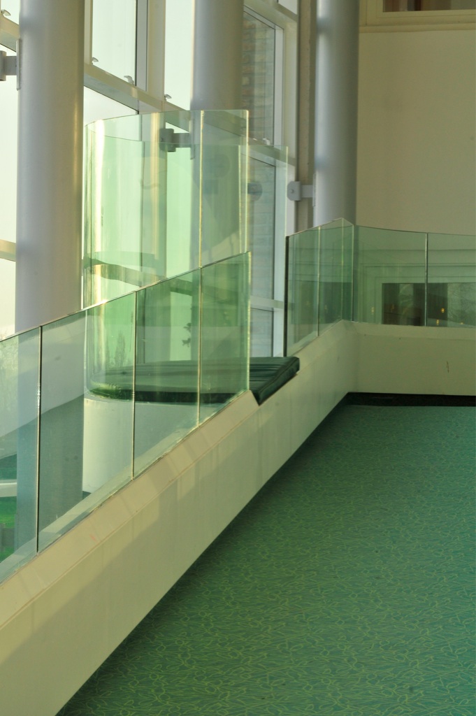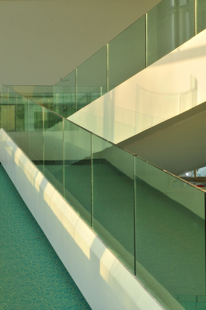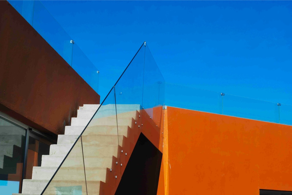 Las barandas se proponen sin estructuras metálicas aparentes, para que no exista interrupción visual y se pueda disfrutar al máximo del paisaje circundante. Contribuye a potenciar el resultado la utilización de "cristales ultraclaros", totalmente transparentes, sin ningún tinte de color en su masa.