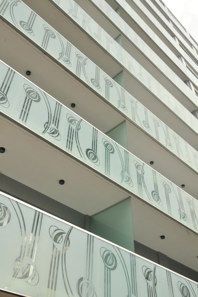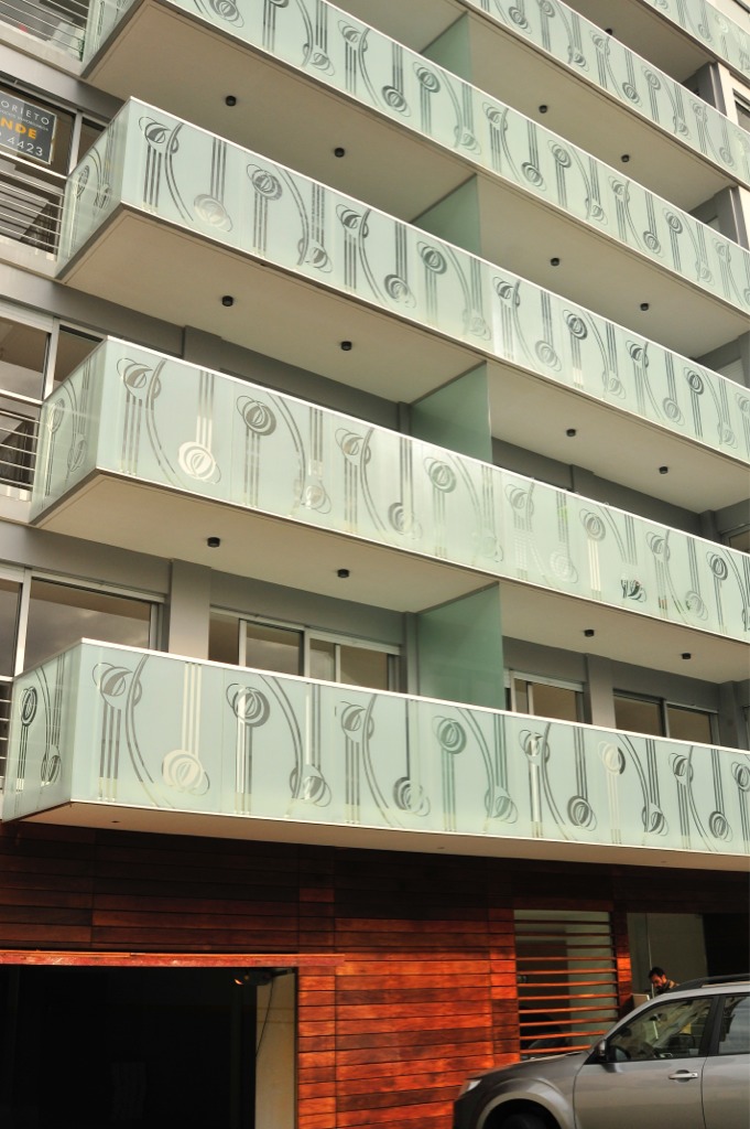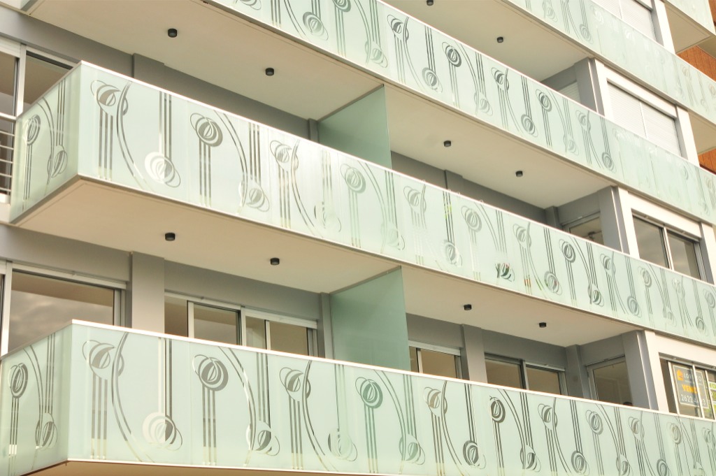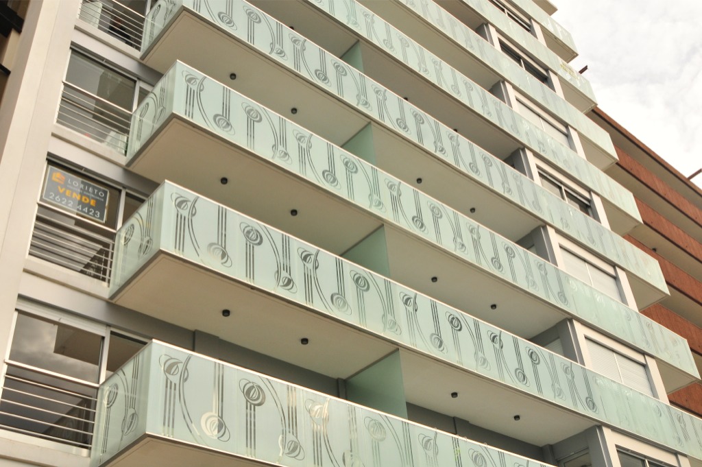 - Barandas de cristal laminado de seguridad con serigrafía color fosco. Separadores de balcón en cristal Opacid.