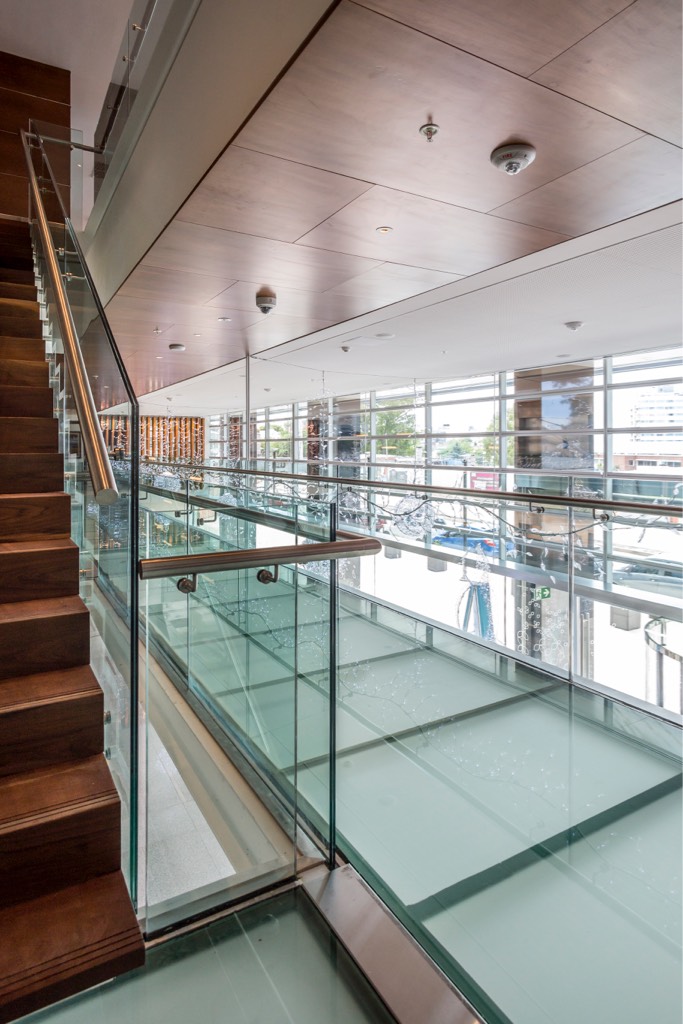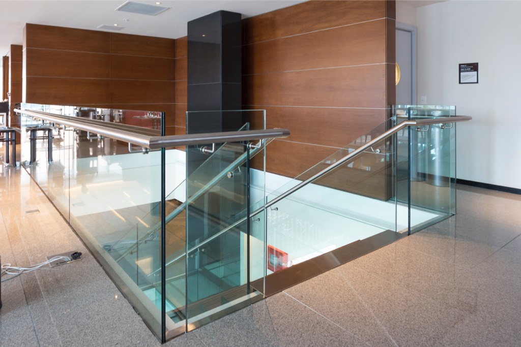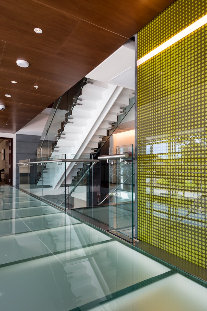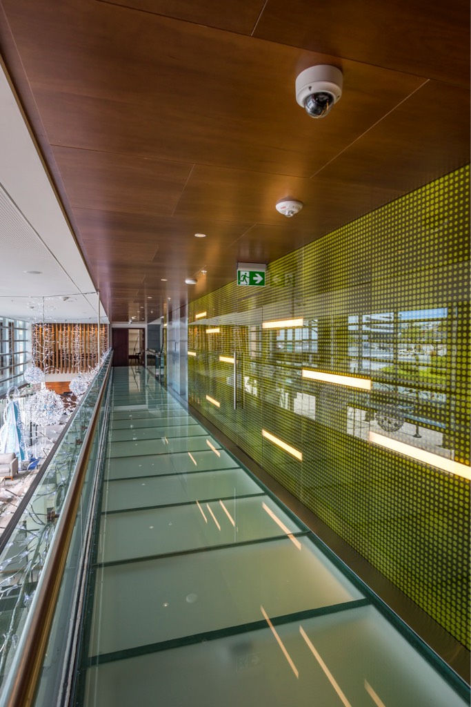 - Serigrafía en revestimientos interiores; barandas y puentes en cristal templado laminado de seguridad.