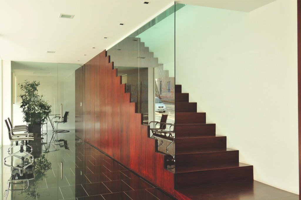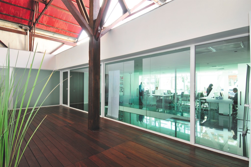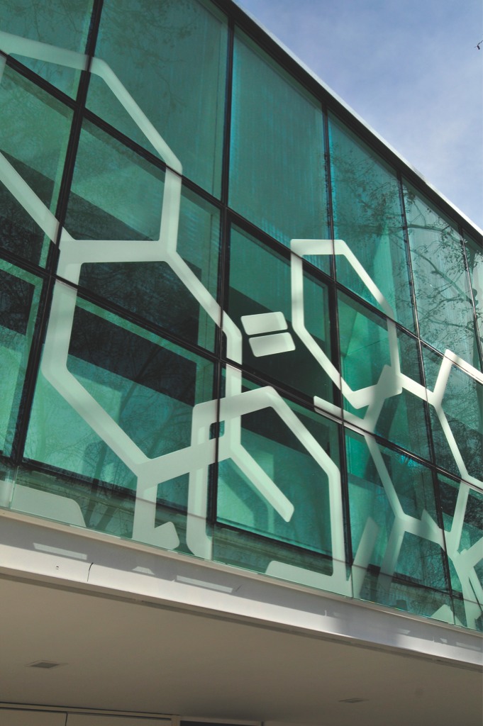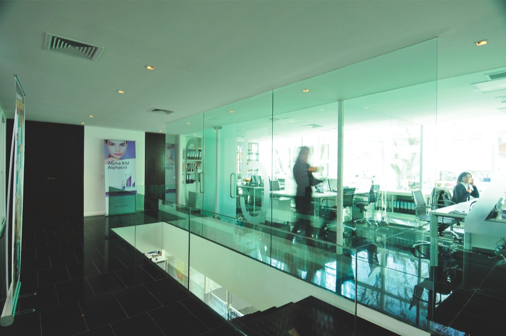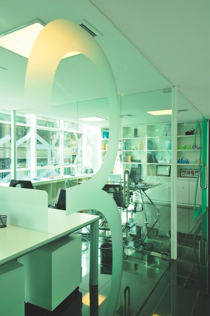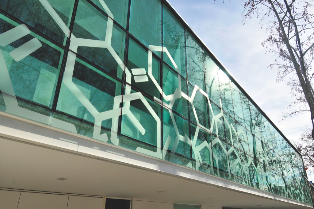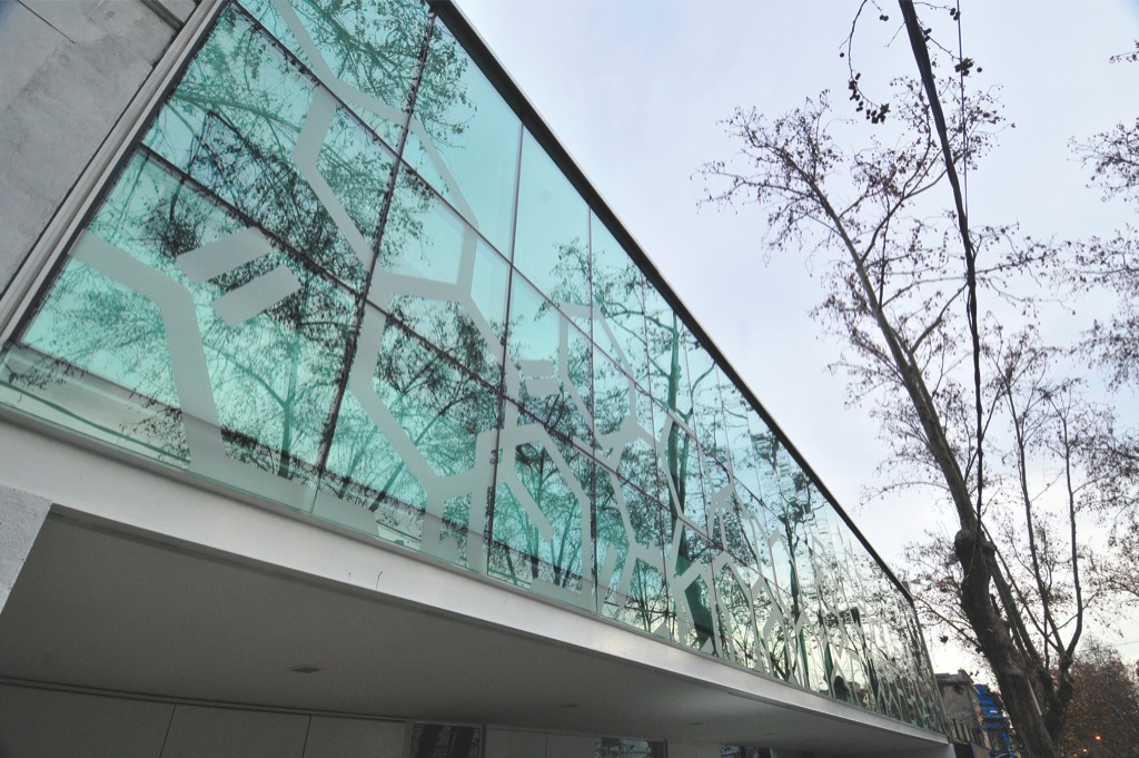 Curtain wall con DVH cristal verde 6 mm. + cristal inc. 5 mm.; cerramiento de oficinas.
