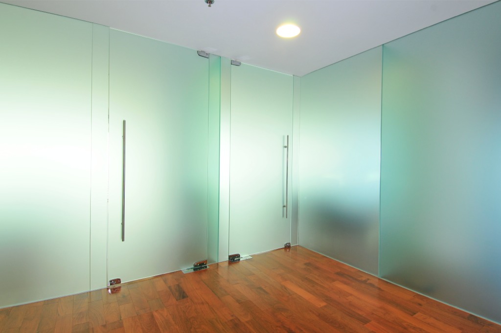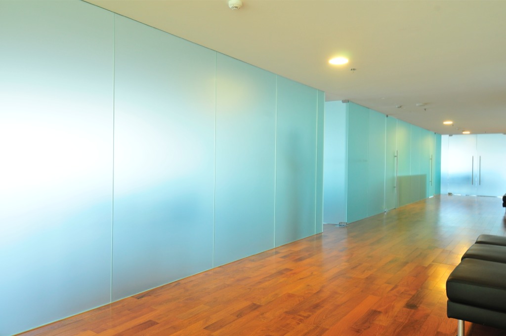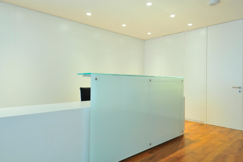 Cerramientos interiores en Opacid. Revestimientos en Glass Splash blanco en recepción y baños.
