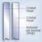 Compuesto por dos o más hojas de Float íntimamente unidas entre sí mediante la interposición de una o más laminas de polivinil de butiral (PVB), aplicadas con calor y presión en un autoclave. Para satisfacer requerimientos de control solar puede estar compuesto por cualquier tipo de Float, incoloro o de color, no siendo necesario que ambos vidrios sean del mismo tipo o espesor.